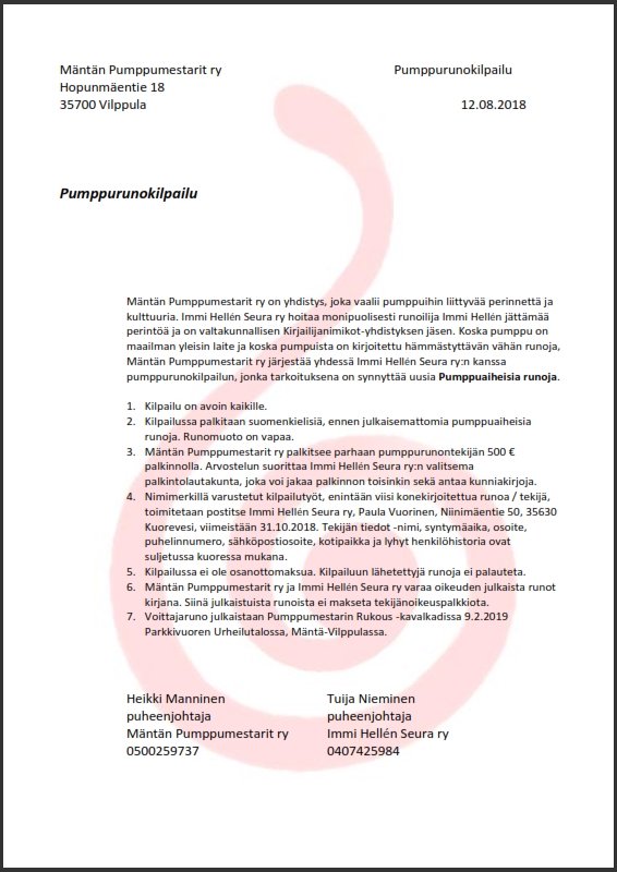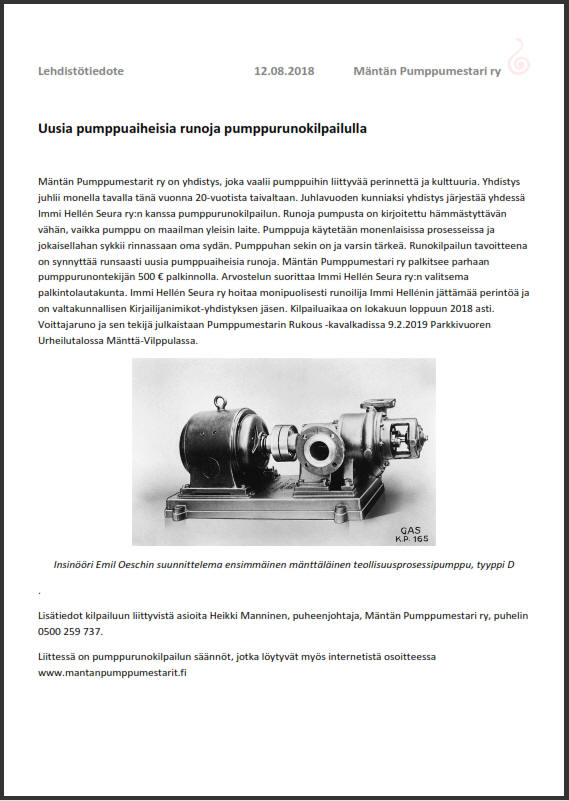 puheenjohtaja, Mäntän Pumppumestari ry, puhelin 0500-259737.